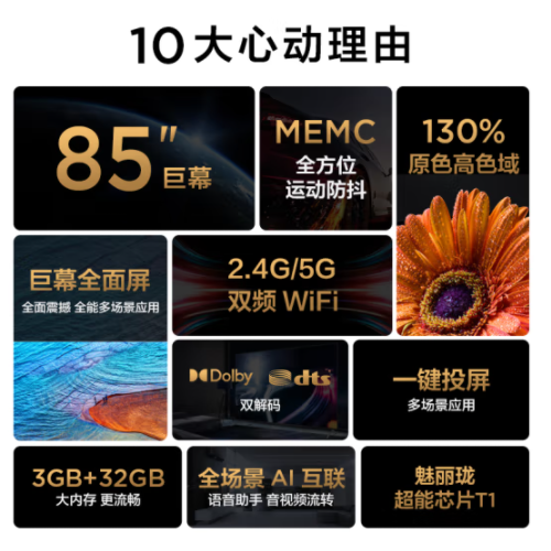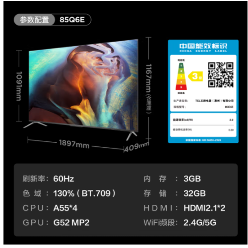 • TCL电视 85Q6E 85英寸 巨幕高色域电视 130%高色域 MEMC运动防抖 4K全面屏液晶智能电视机